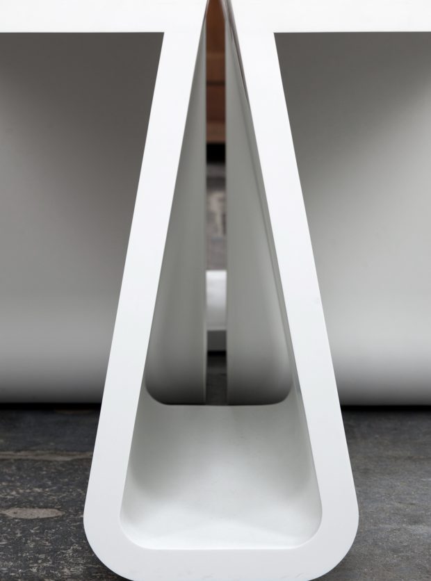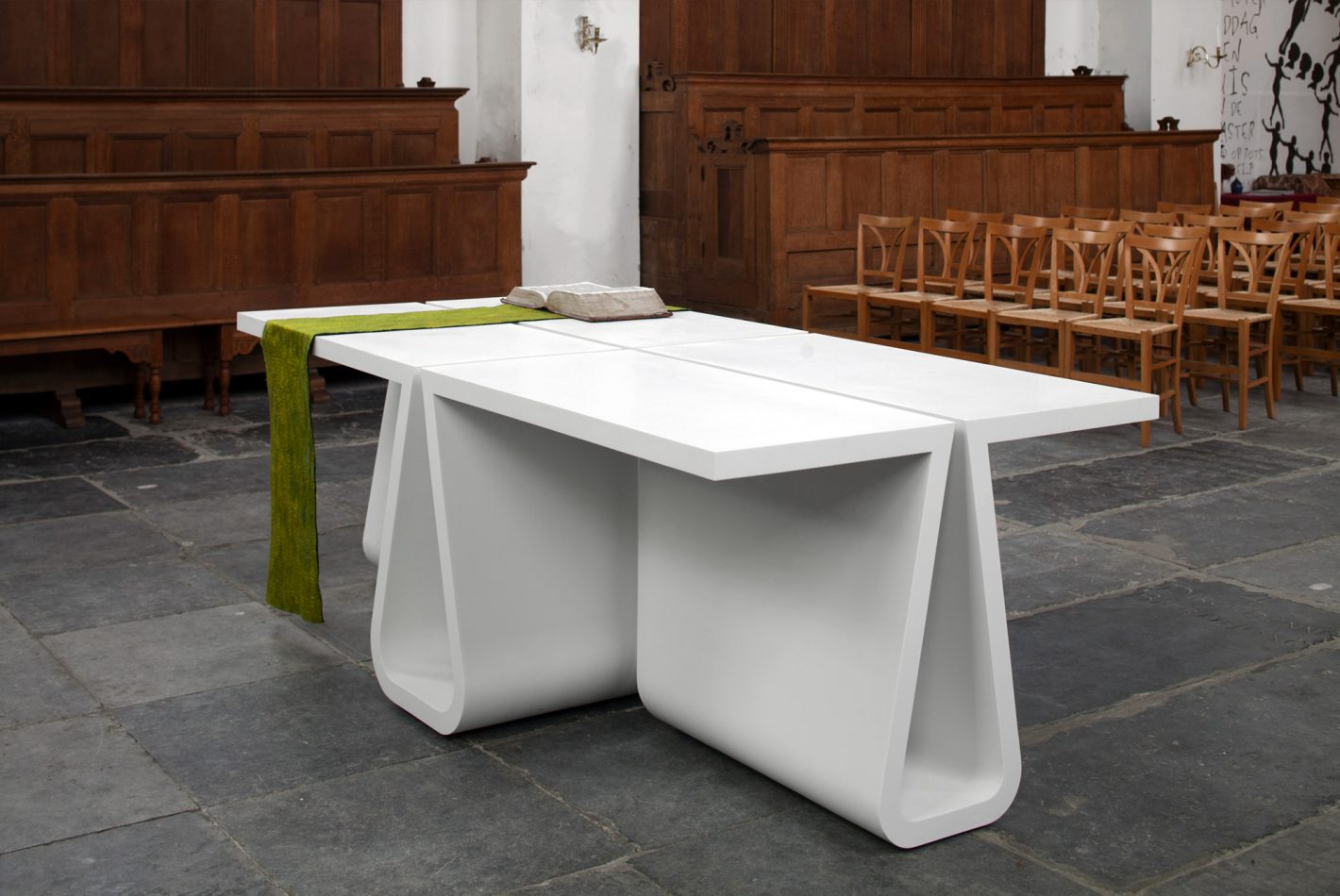 The new altar adds to this stylistic plurality a contemporary dimension. A gentle folded, white surface reminiscent of a tablecloth brings its corners together by articulating a table plane with four segments, reflecting the floor plan proportions of the church of 2:1. The narrow gaps in-between the segments, a void, forms a subtle cross figure. The object is made of acryl.