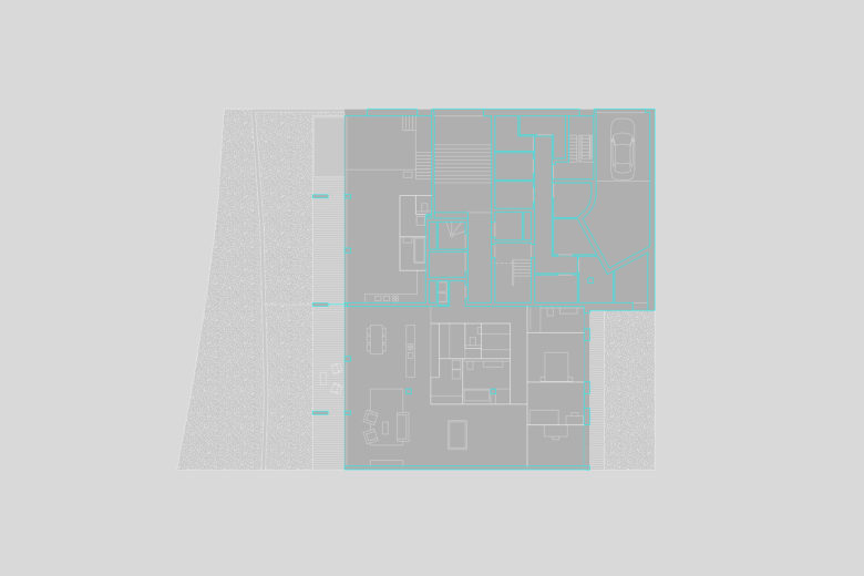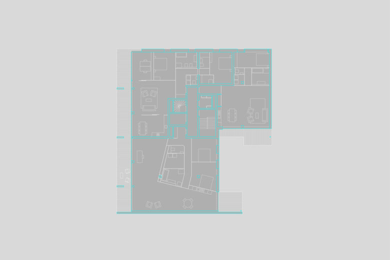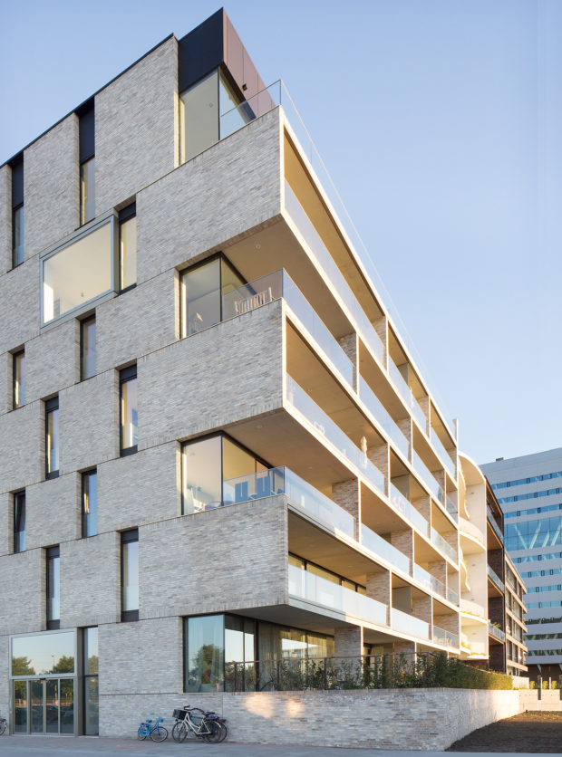 Corresponding with the landscape scale, the river façade combines six generous balconies into three frames of plastic expression which contain a series of shifted, short brick walls with perpendicular orientation in relation to the façade, guaranteeing unobstructed view from inside out while complying with the masterplan’s requirement for the presence of brickwork in all the public facades. By contrast, in a playful reversal between open and closed, the urban street façade takes up the tectonic pattern of shifted brickwork planes, itself a reflection of the logic of brickwork texture. The architectural logic of this non-loadbearing façade is to give expression to the technically necessary expansion joints.