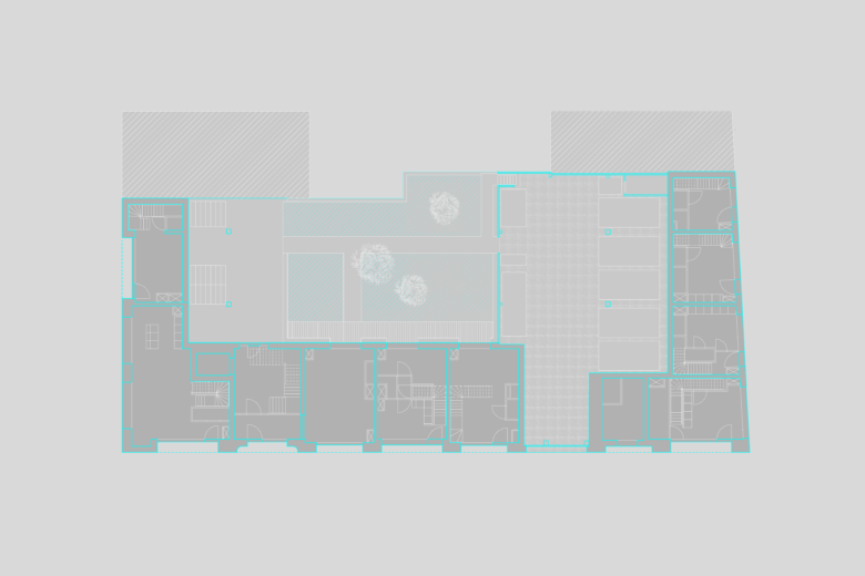 The building’s architecture balances tradition and innovation. Its street-facing façades are composed of traditional cavity wall masonry in a beige, sand-toned brick. This material continues from the upper levels down to the ground floor plinth, ensuring visual cohesion. However, subtle detailing creates a refined contrast: the plinth features a rustic texture with recessed, dark mortar joints that add depth and weight, while the upper façades use flush joints in a colour matched to the brick, lending a smoother, more uniform finish.