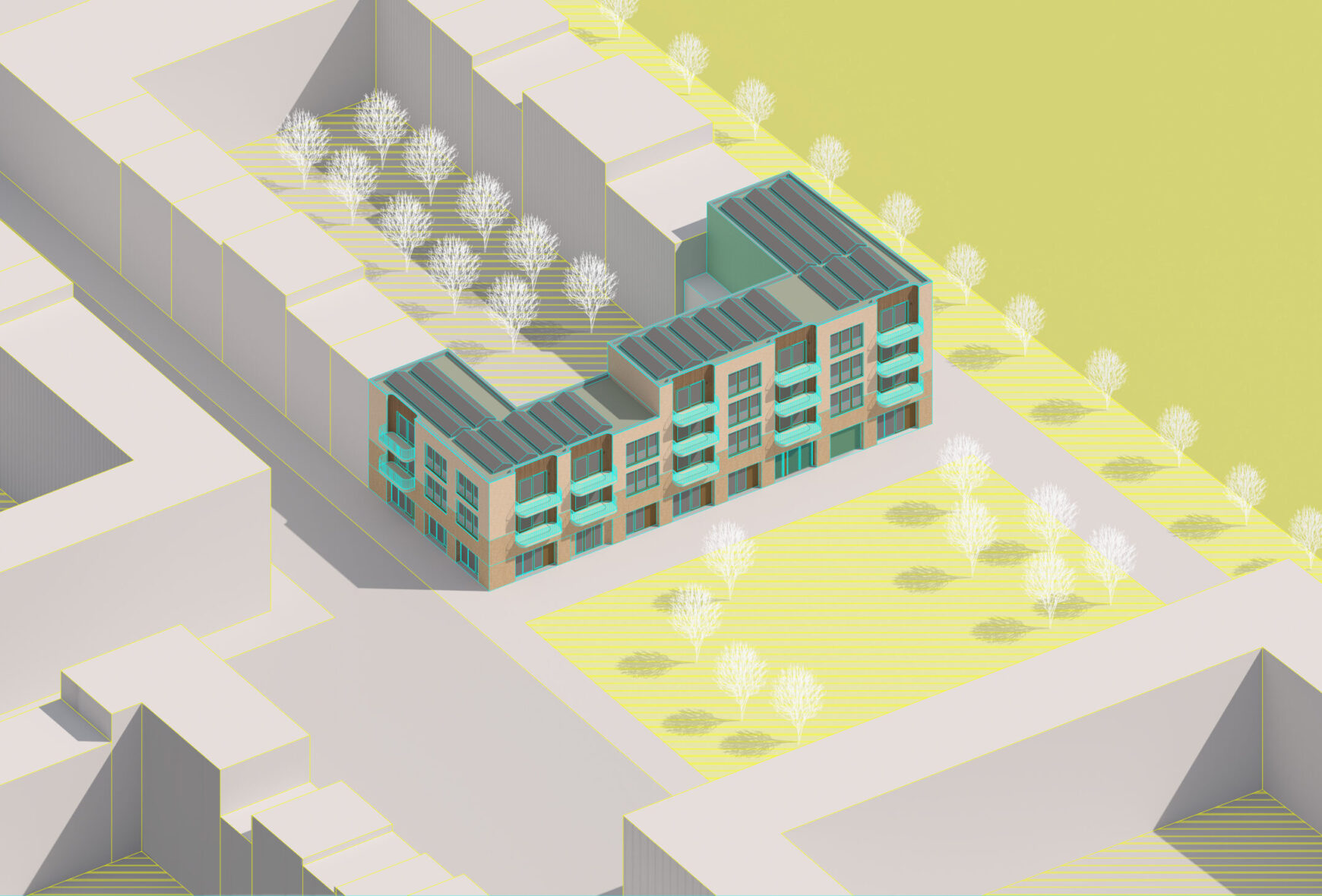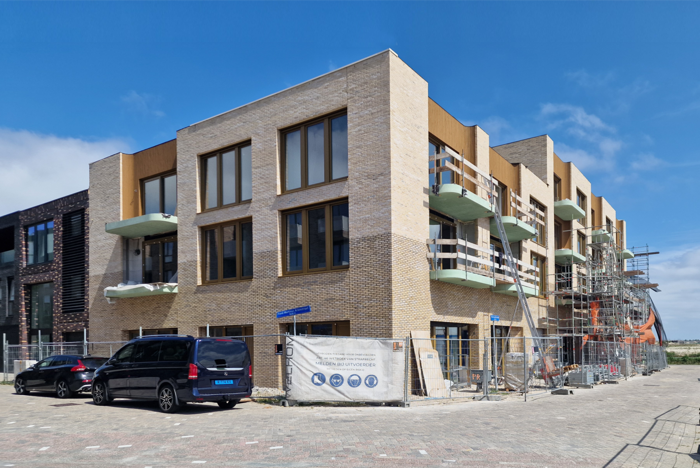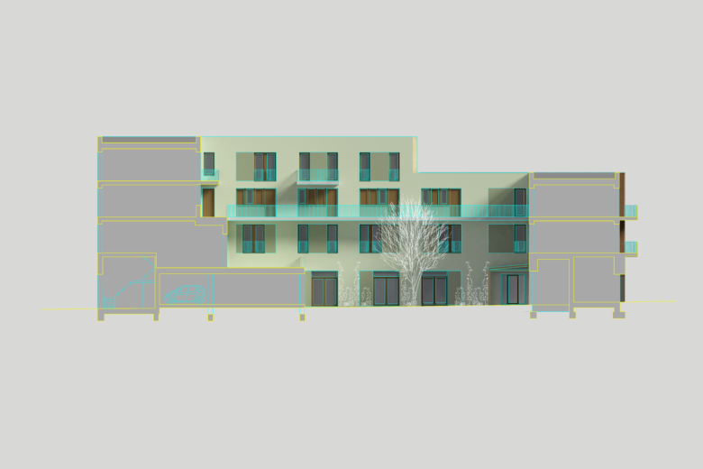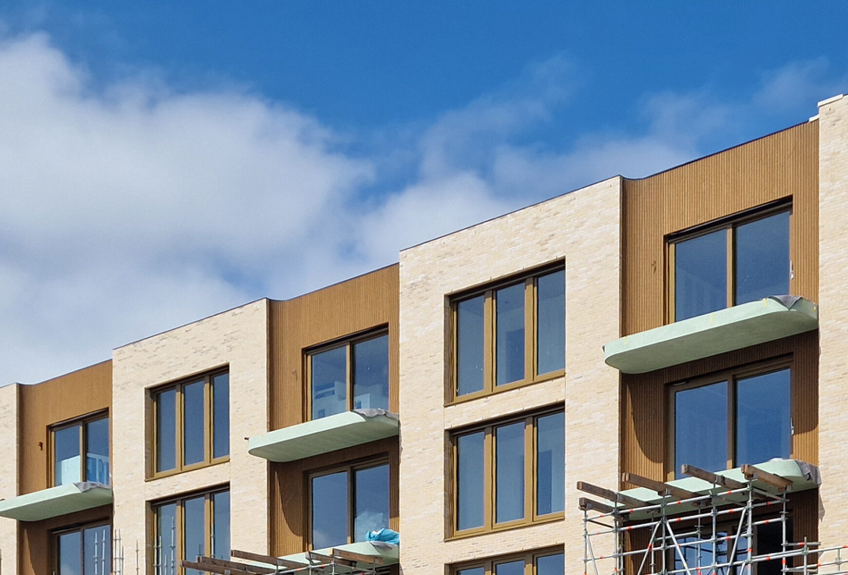 This wood motif is further developed on the east façade, where there are no balconies. Here, wooden panels—set slightly back on both sides of each window—introduce depth and rhythm. These details visually enlarge the window openings, giving the east façade proportions and character that harmonize with the building’s other elevations.