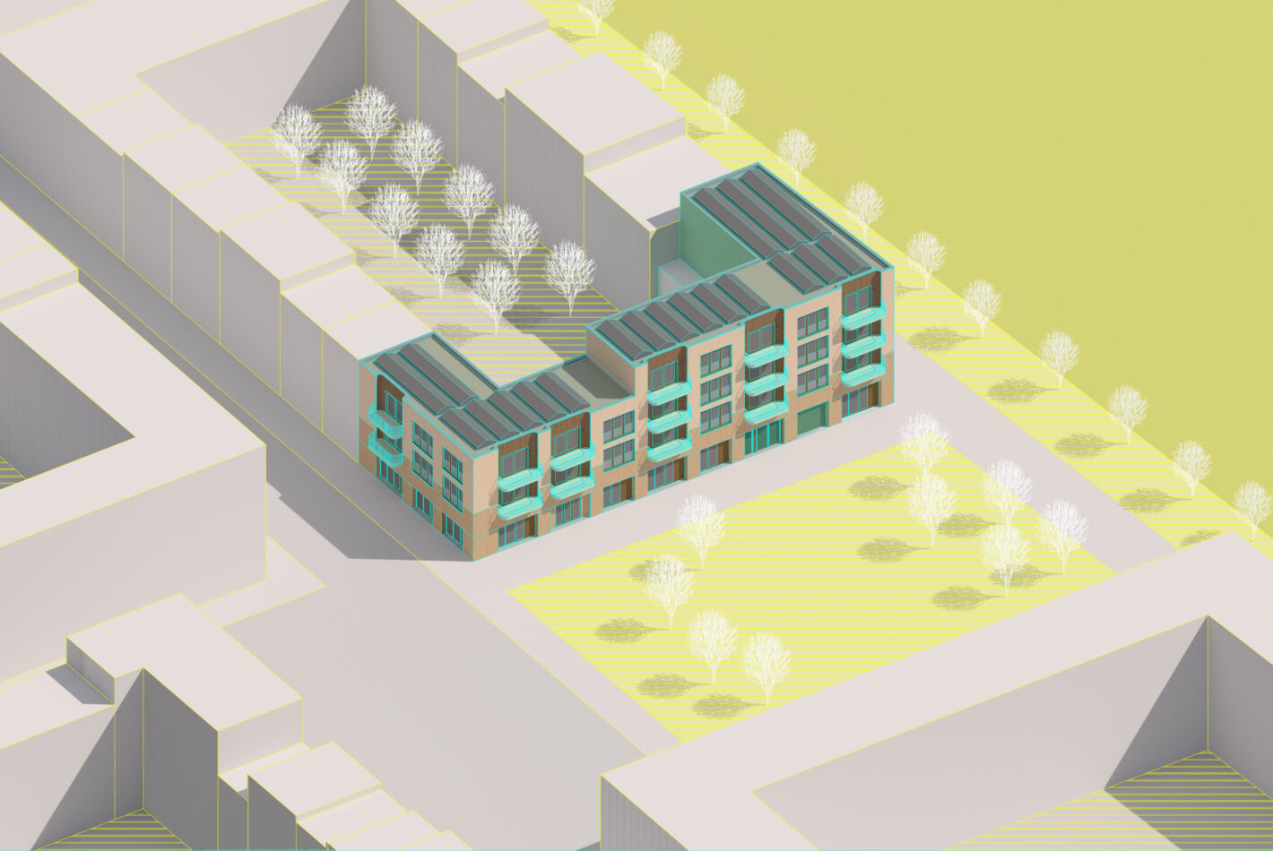 Facing the inner courtyard, the façades shift in materiality to insulated stucco, lending a lighter, more open feel to the shared garden and creating an inviting atmosphere for residents.