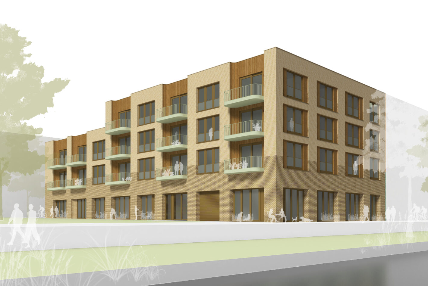 Wooden façade elements—such as balcony panels and detailing—are treated with pigmented stains to slow the natural greying process, preserving the character of the wood while allowing its natural texture to remain visible. The self-build group has committed to regular maintenance, ensuring the building’s material integrity and design intent endure over time.