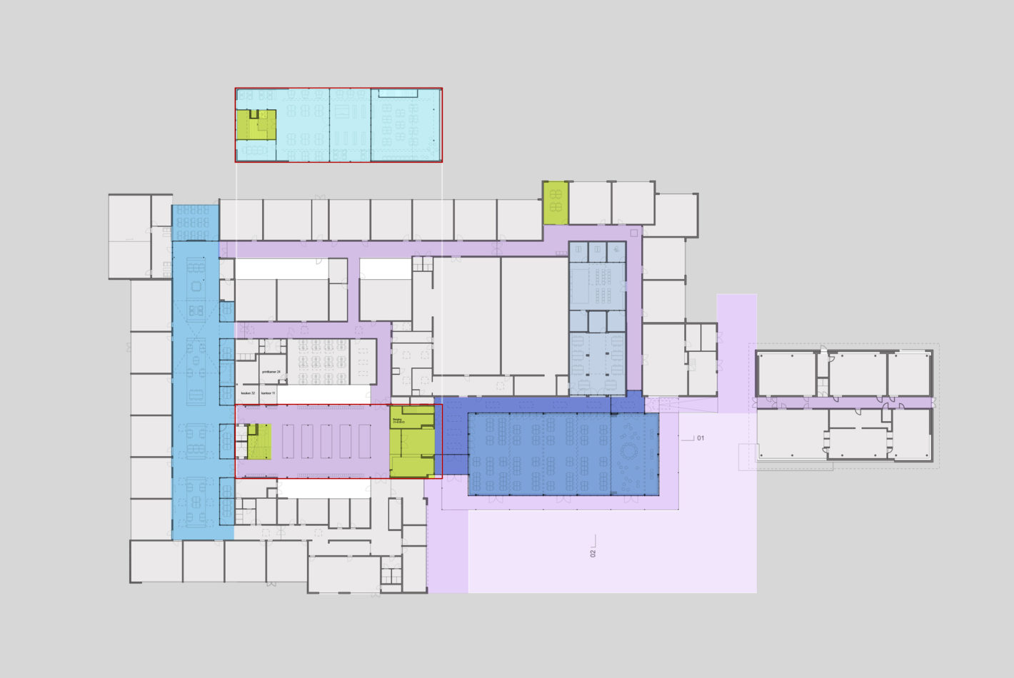 Our approach identified the existing, extensive yet mono-functional circulation space as the school’s spatial key identity. We proposed a series of chirurgical, precise interventions that would improve functional circulation and enrich the in-between spaces in order to stimulate various social and learning activities through local situations, atmospheres, and places to be appropriated. Additionally, a new multifunctional aula building located at the heart of the school, its central outdoor plaza was part of the proposal.