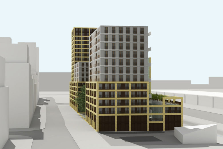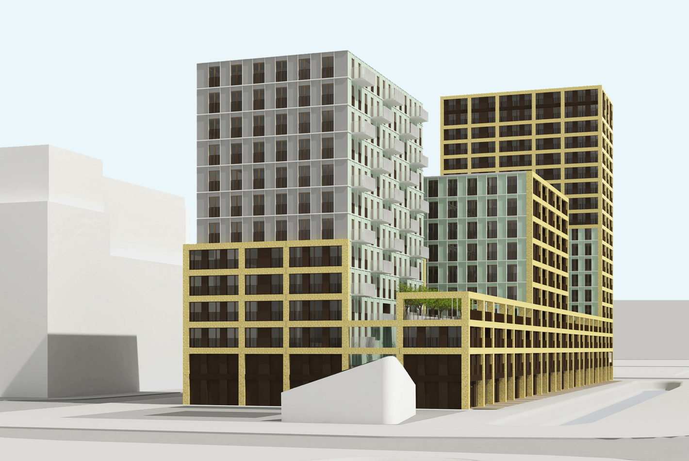 Located at the edge of transformation area of Amstel III, a former monofunctional office strip currently turning into a mixed-use metropolitan area, and bordering at the adjacent warehousing district, the building aims at reconciling the large scale of its context with the human scale of community-oriented urban living.