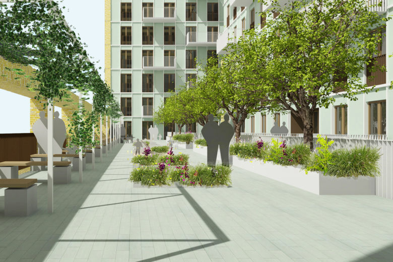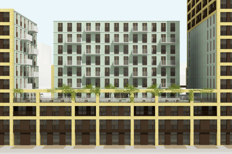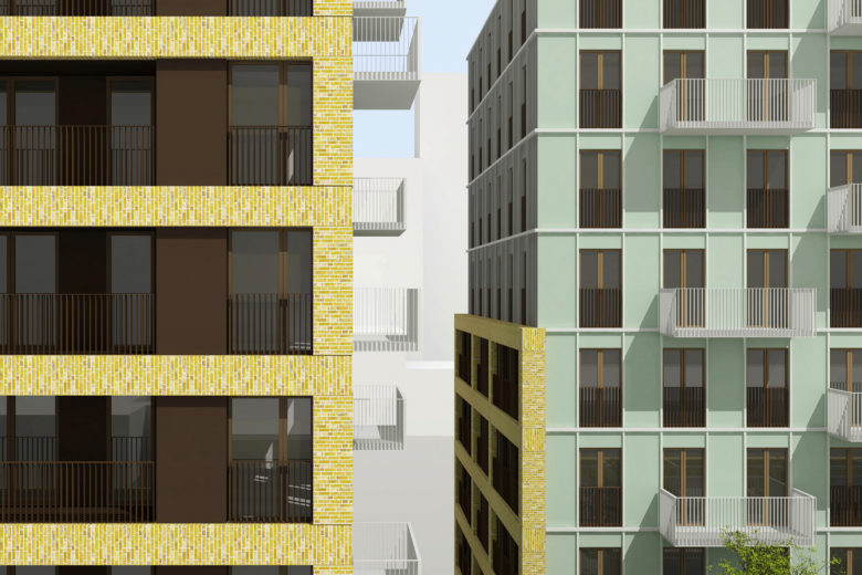 The architectural treatment of the facades further underlines the interplay of two levels of scale. The outer shell of the complex is articulated as bold horizontal grid with prefab brick elements while the facades of set-back volumes have a distinctively vertical, plastic expression made of prefab bio-based panels. While apartment outdoor spaces along the building perimeter are conceived as loggias, they change to projecting balconies around the three communal outdoor spaces and emphasize through plasticity human scale and activity.