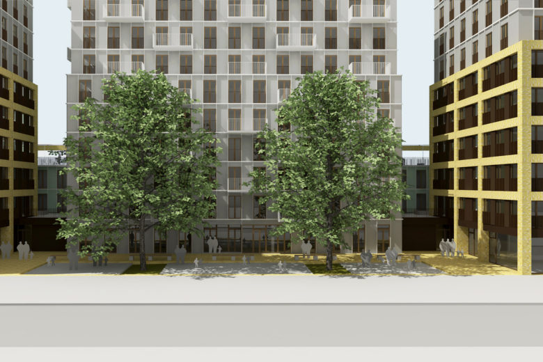 Introducing the urban morphology of a strip with against each other shifted tower volumes that are framed into a single architectural figure by a combining plinth, the project articulates three distinctive outdoor spaces dedicated to the enhancement of social encounter and co-habitation. At the Eastern side, a small urban plaza combines three of the four main entrances of the complex and offers an inviting space to residents of the building and its neighborhood. At the Western side, set against the afternoon sun and situated to offer a panoramic view above the adjacent low-rise district, two raised belvederes offer protected, spatially well-defined communal terraces exclusively accessible to the residents of the complex.