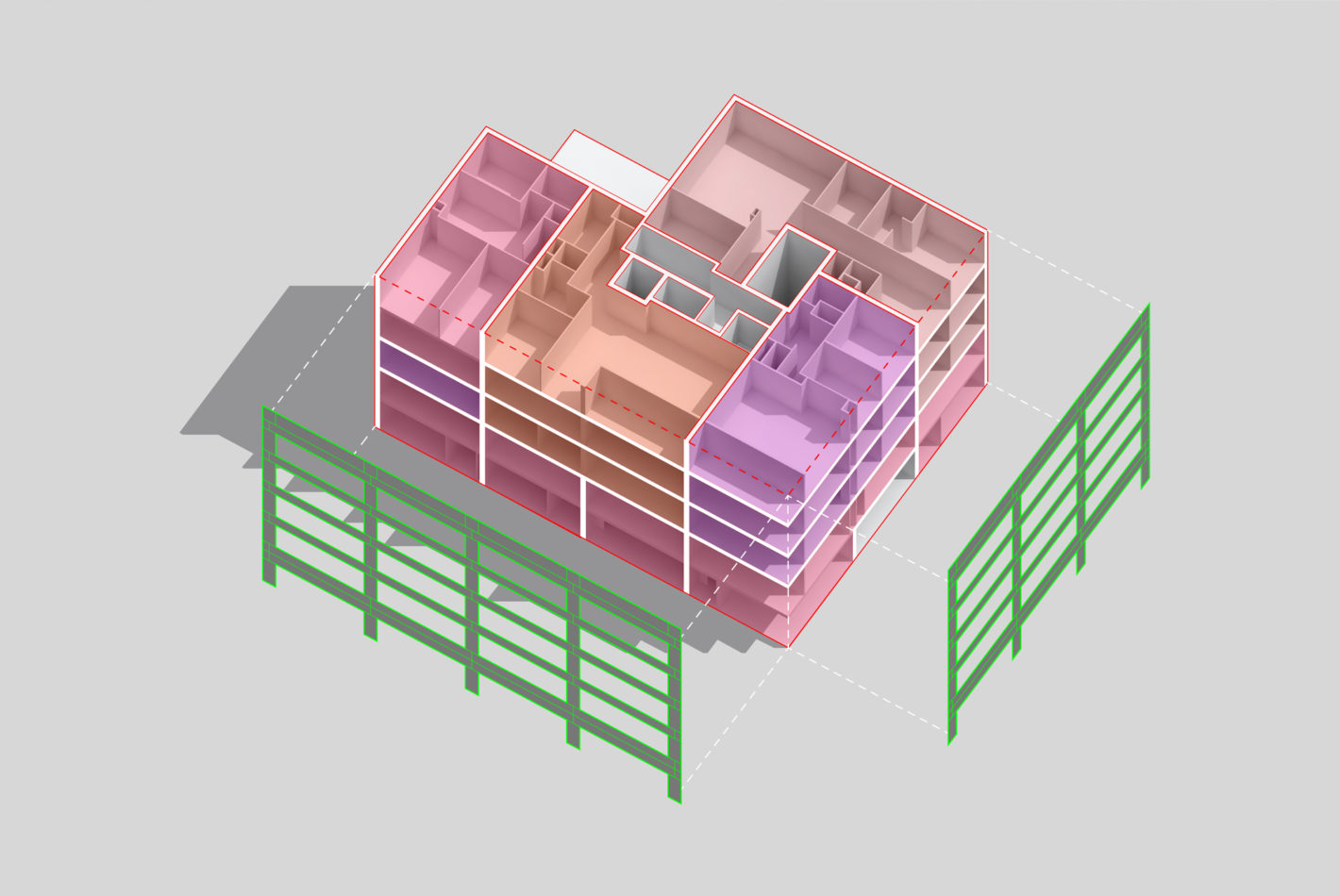 At the exterior, these differences are more subtly articulated. A homogenizing tectonic framework of massive concrete panels makes reference to the Modernist legacy of the location with an aesthetics based on the Cartesian grid, one of the principal ideological instruments of Modernist architecture, and its related distinction and hierarchy between primary structural components and secondary light-weight fill-ins.