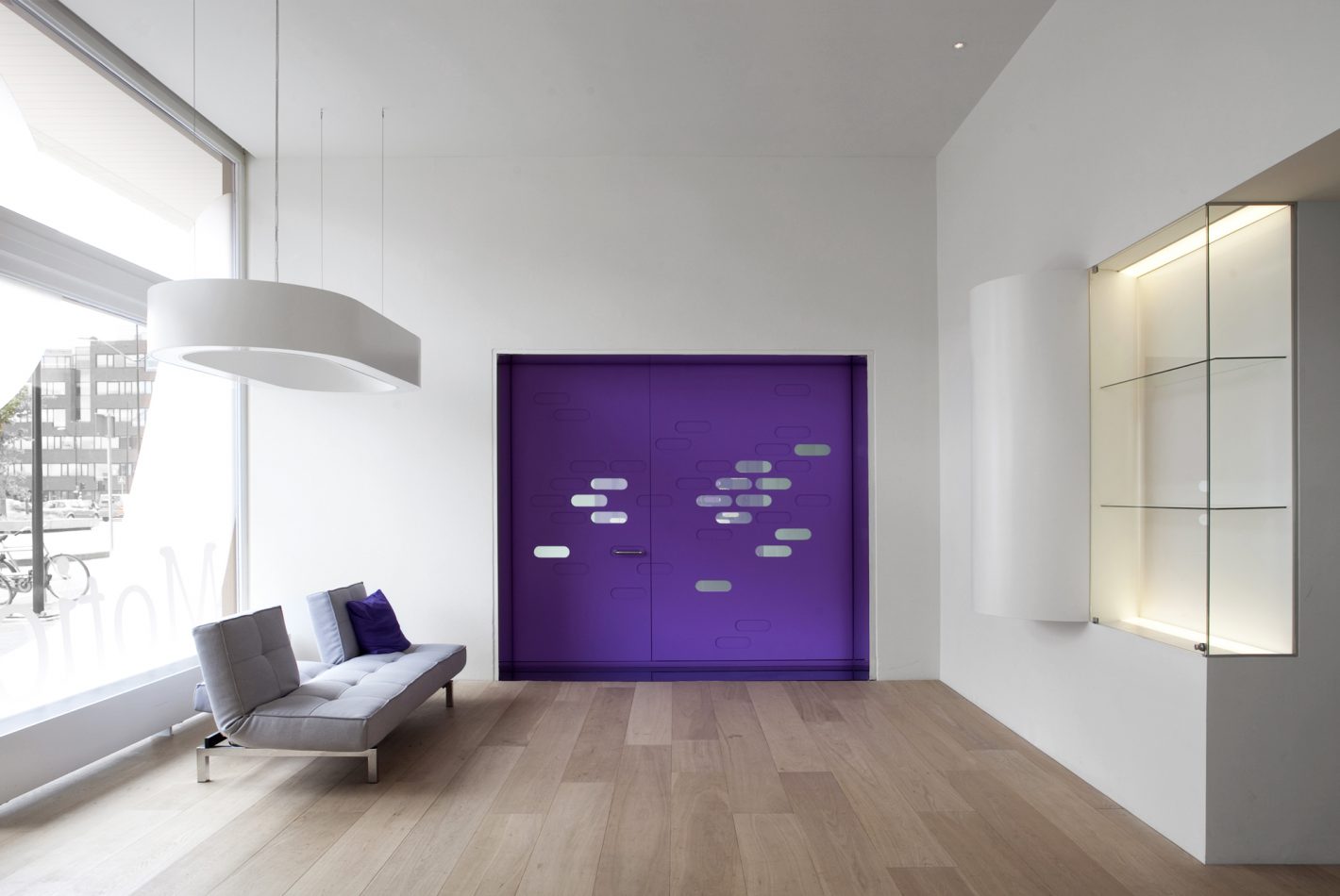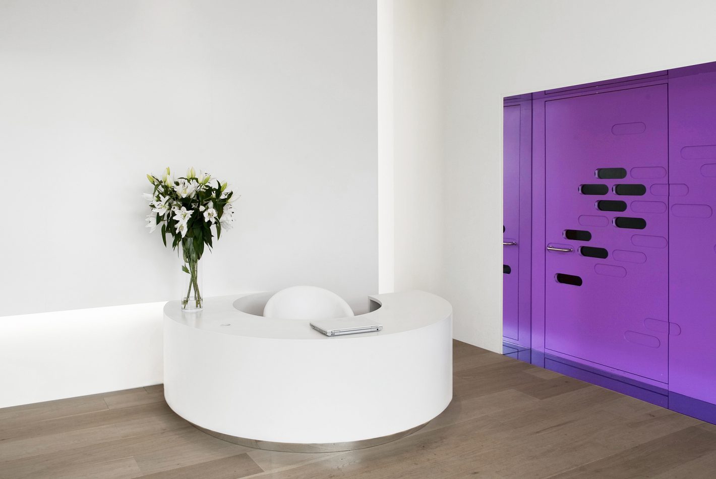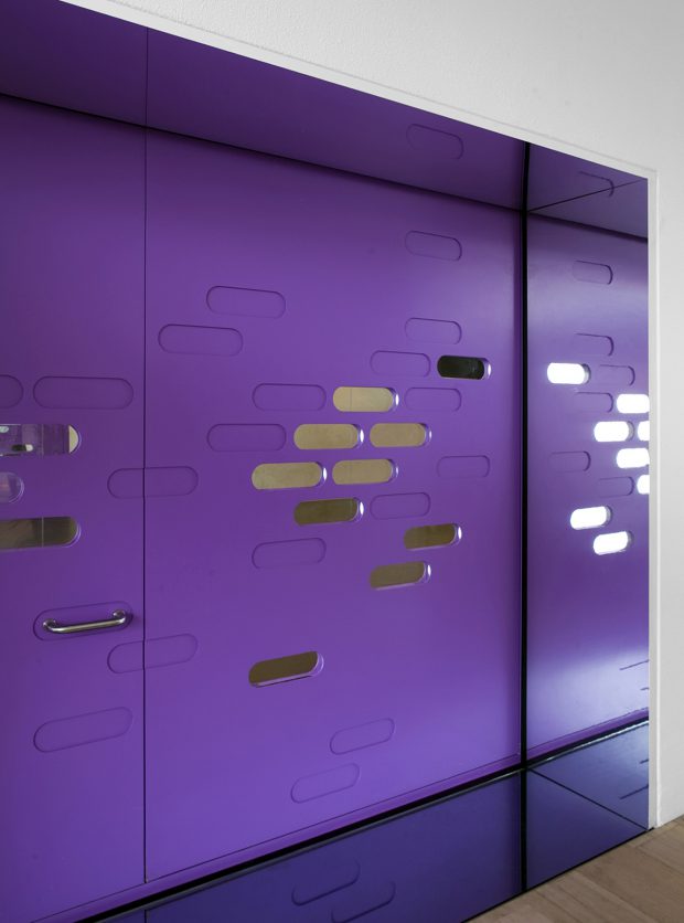 The access to the studios at the opposing ends of the lobby is highlighted by purple doors with a swarm of open and closed openings. A series of four thresholds in the lobby has mirroring frames that align with the studio door poles and flirt with the body-conscious atmosphere of the studio, playing with a heightened visual sensibility of looking and being-seen.