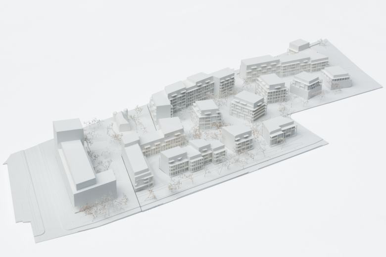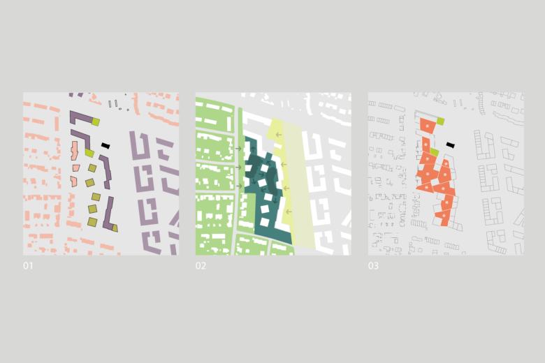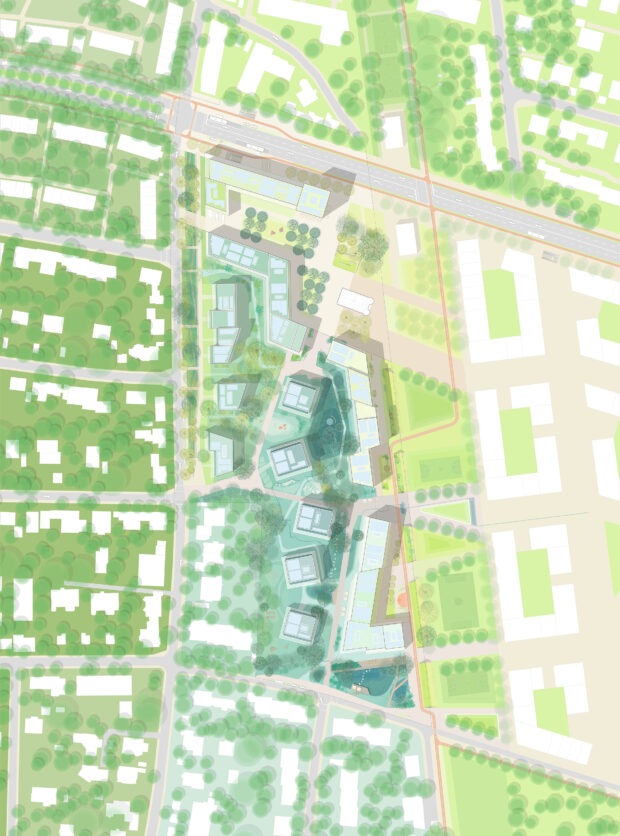 Our proposal establishes a context-sensitive connection to these two different spatial and morphological conditions while simultaneously creating its own strong local identity. We have developed a vision which seamlessly combines three different landscapes and four urban building typologies. The facades and generous outdoor spaces shape different public outdoor areas creating green chambers and highlighting the sense of living together and caring for the communal ecological and social environment.