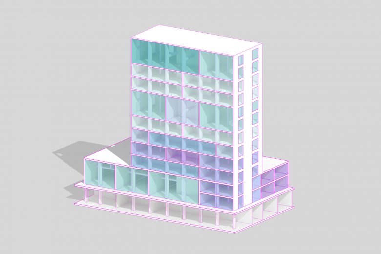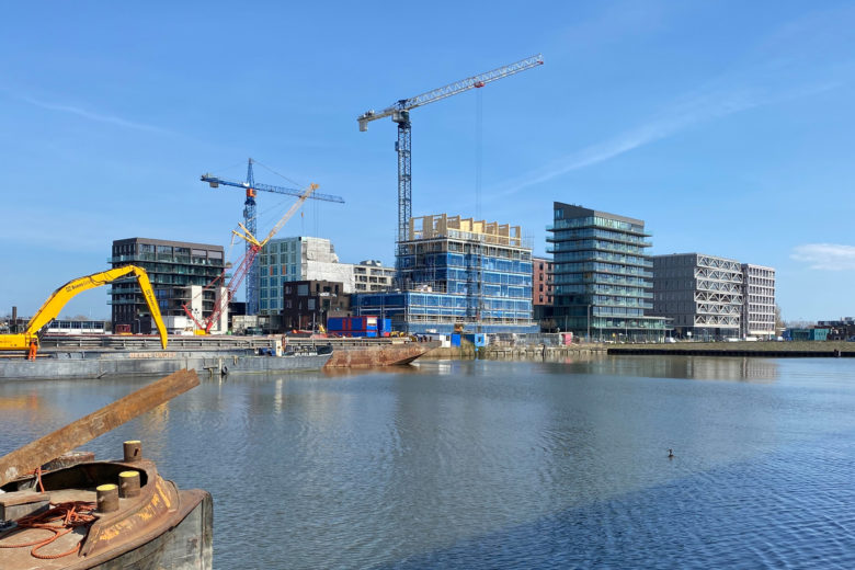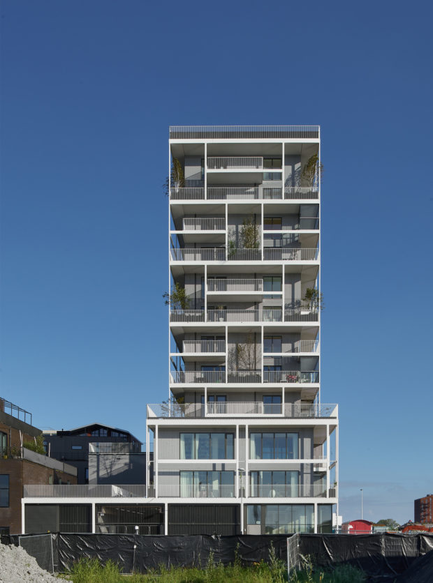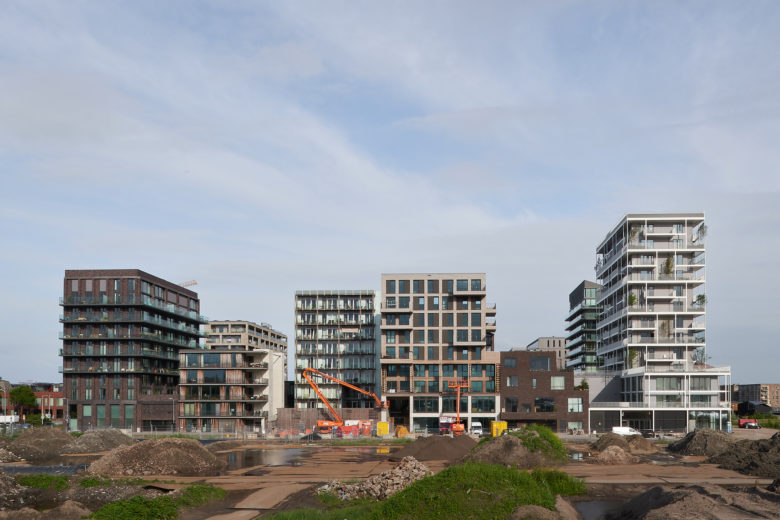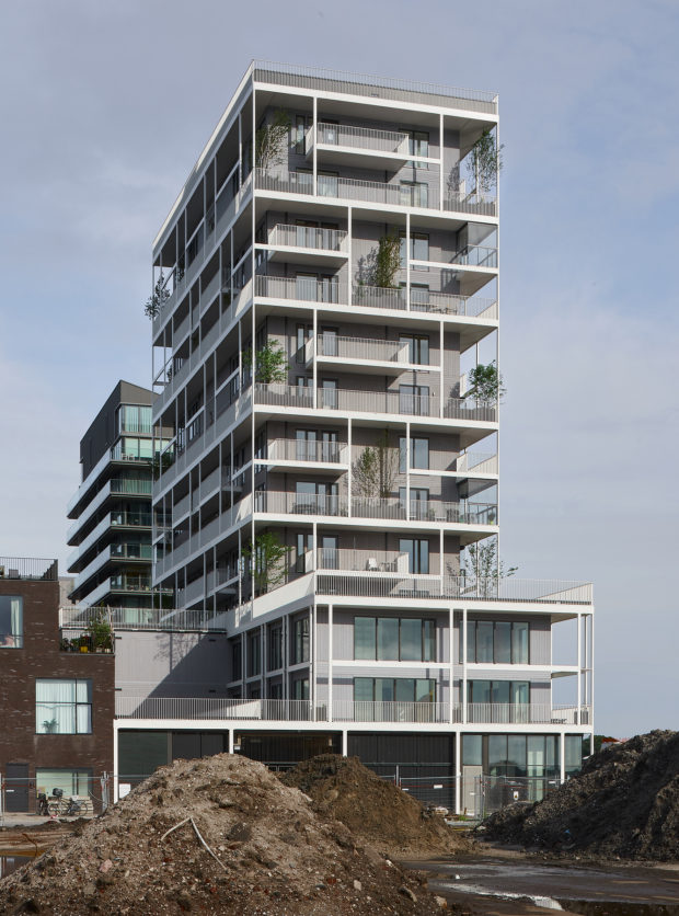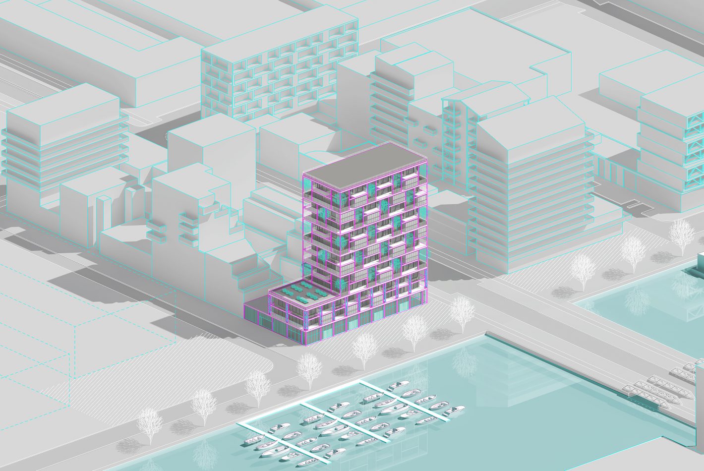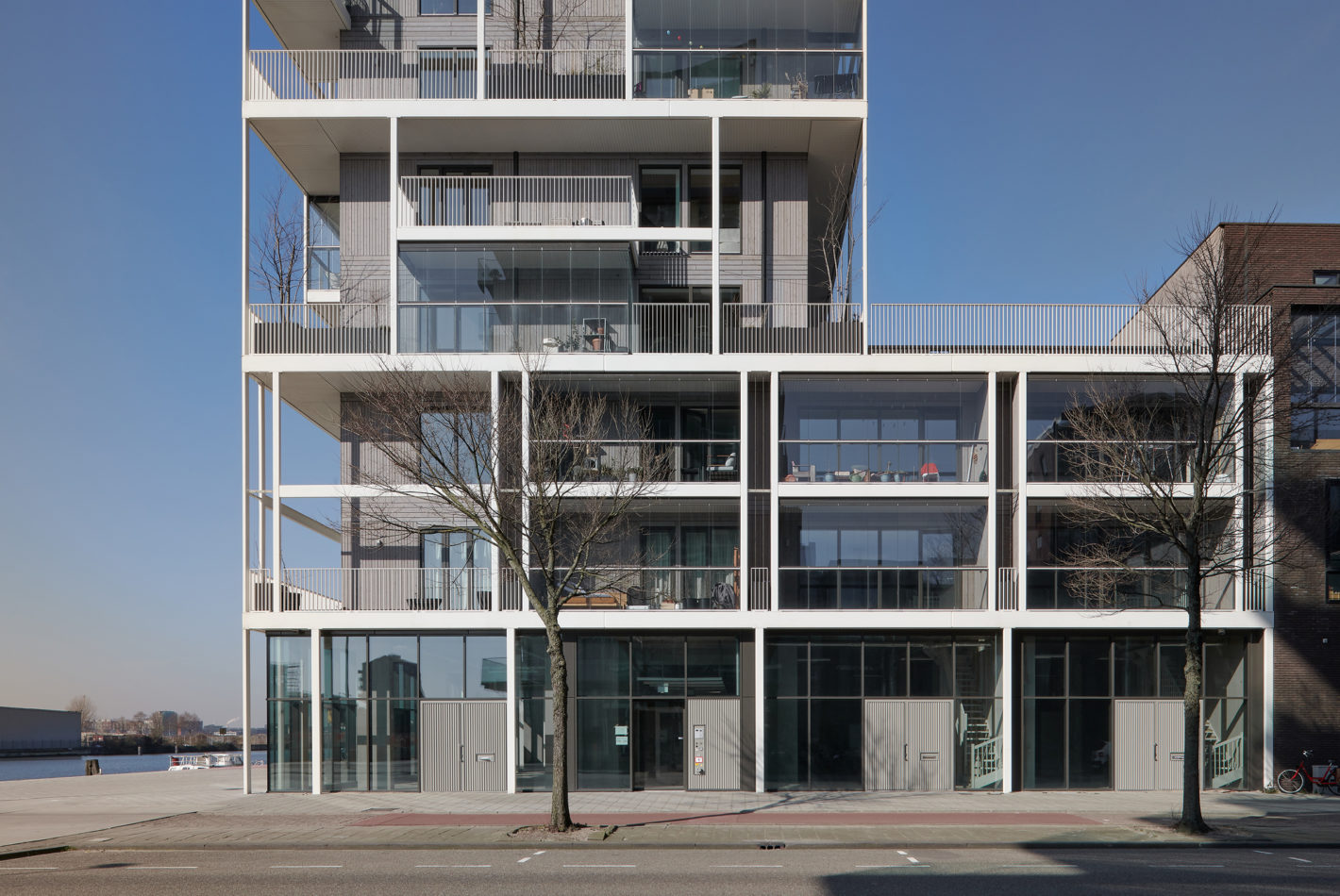The building is a mixed-use residential tower in post-industrial Amsterdam Buiksloterham with 35 housing and commercial units and an on-ground parking garage. Located in a former industrial harbor area, it occupies an exposed lot marking the intersection of a main street and a former industrial harbor basin. Stories is the result of close collaboration between its future residents, architect, contractor, and advisors.