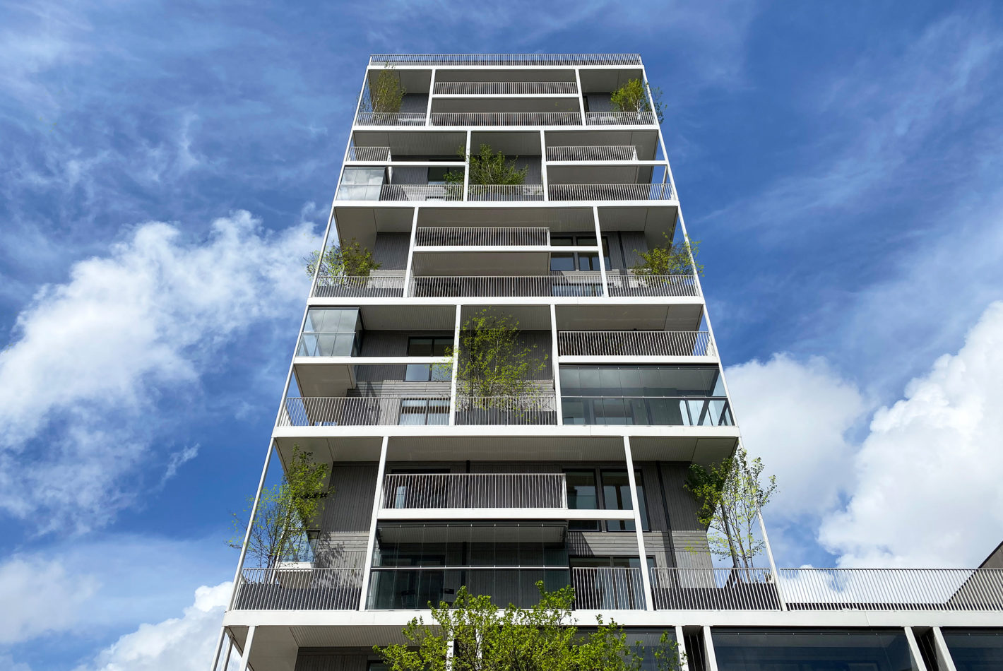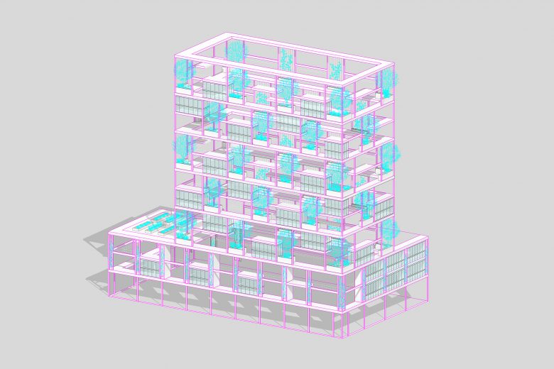 Yet Stories does not only provide private space but addresses collective urban living. An enveloping steel structure contains extensive outdoor spaces in the form of private balconies and winter gardens which are simultaneously architectural shading elements, a communal roof for urban farming that is connected to a shared, multifunctional indoor space, and 57 double-height vegetation units. The larger ones of these are niches for trees, bushes, grasses, and related animal life. They act as privacy screens between individual units, operate as infrastructure providing a healthy environment and microclimate, enrich the local urban biodiversity, and add seasonal, soft and sensual expression to the building. Stories provides habitat for an expanded collective of humans and non-humans.