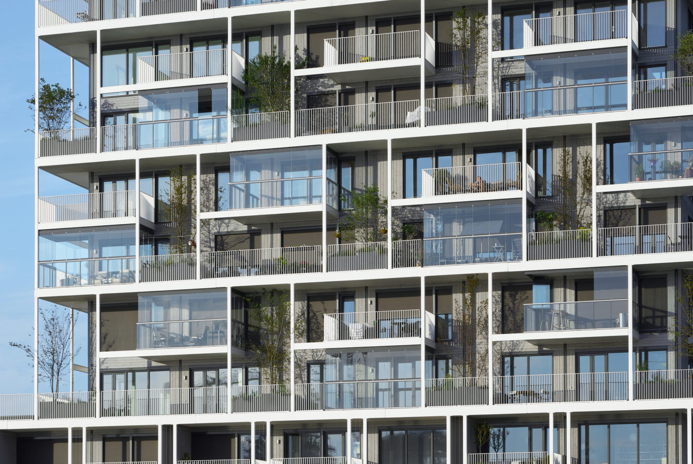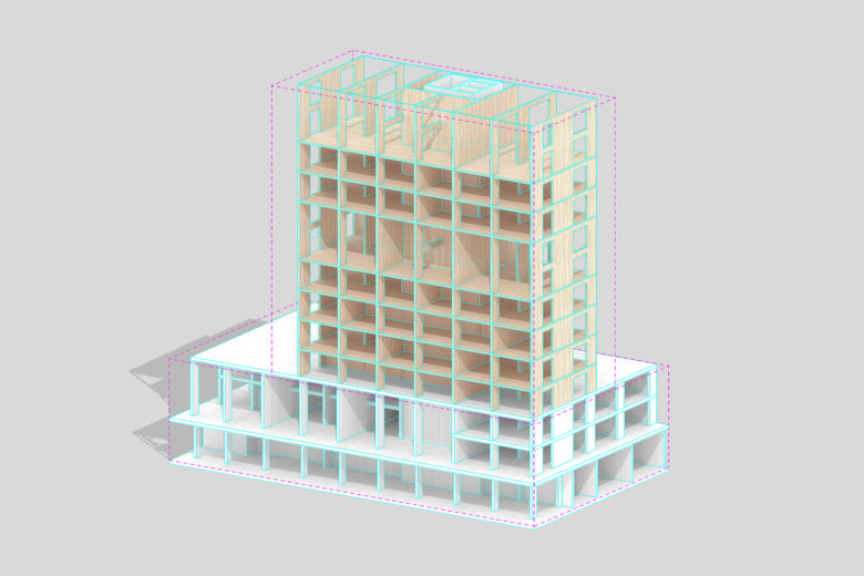 The plinth of 11 m height consists of a conventional prefab concrete structure and forms the basis for a 45 m high tower made from CLT (cross-laminated timber) plate construction. The mass timber construction determines the bay width of 4,80 m, leading to a floorplan spanning over 6 bays. Large openings allow for spatial connection across the bays, facilitating flexible partition from one to six individual units per floor. The walls are clad with fire-resistant and soundproofing plasterboard. The floors are equally made of CLT-plate, exposed as timber ceilings on the floors below, and combined with a foam concrete mass layer for acoustic insulation.