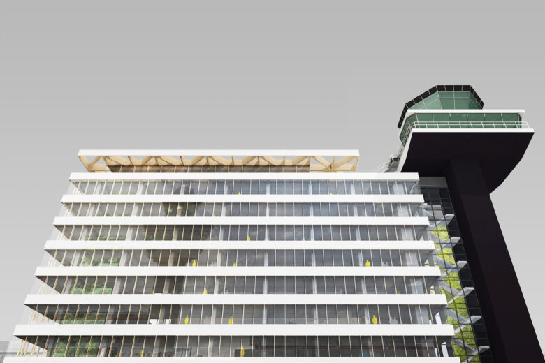 Dutch international airport Schiphol, ranging among Europe’s busiest airports, is also the location of a high-quality business district. One of its most iconic office buildings is Skyport, formerly home to the Schiphol headquarters, connected to the old air traffic control tower and located immediately behind airside.