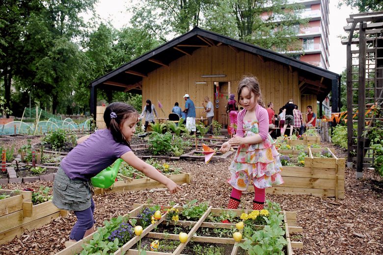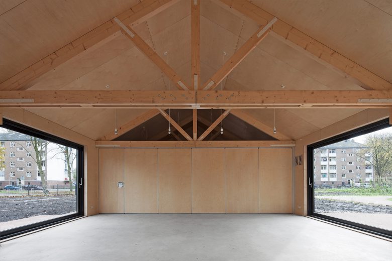 Central feature of the Urban Farm is a communal ‘living room’ that is exposed by large glazing to the surrounding park landscape and of inviting character. A part of the windows can be widely opened up with sliding doors and completely closed for protection against vandalism by a double set of transparent and opaque sliding doors. All three buildings have a structural frame of timber.