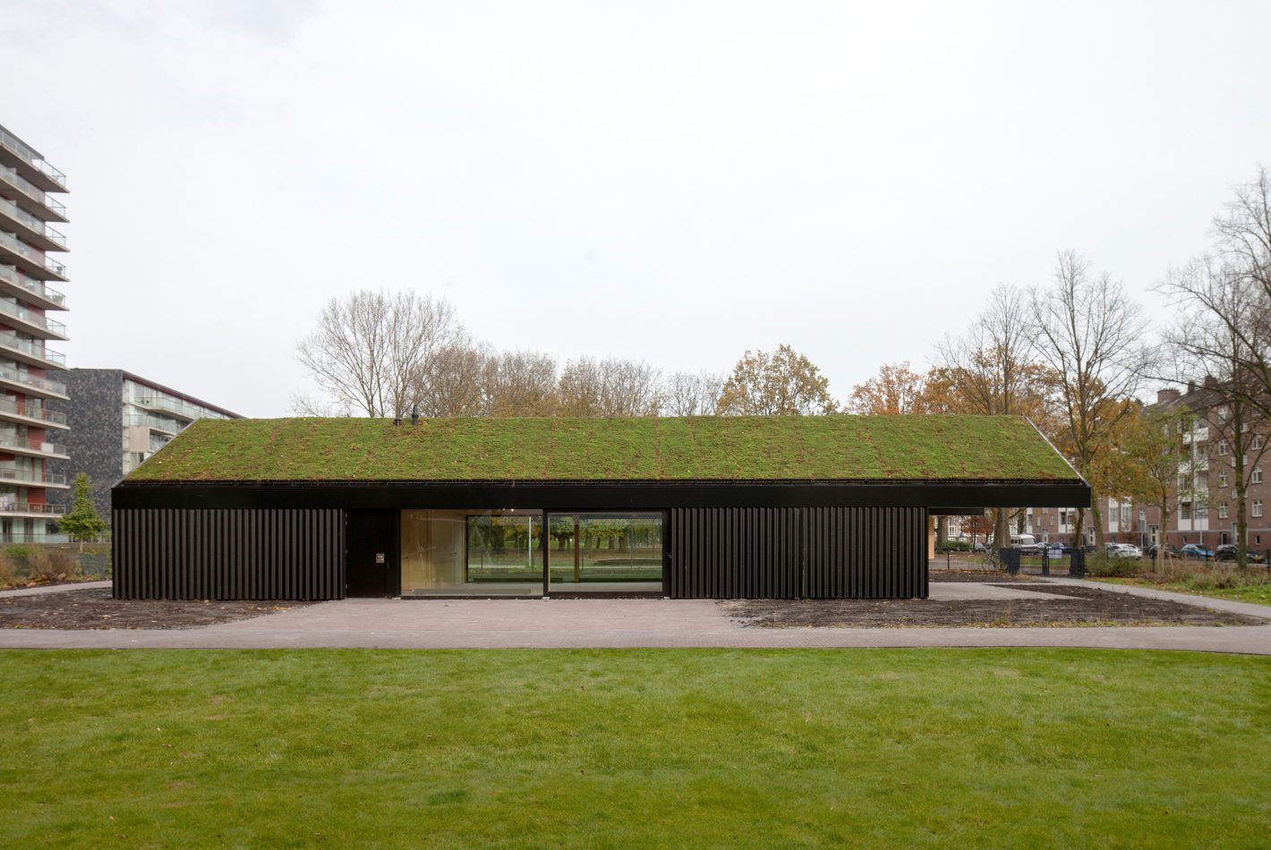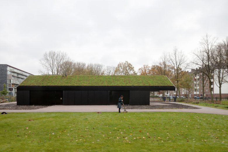 Urban Farm Osdorp is a low-budget public building ensemble located in Botteskerkpark, Amsterdam Nieuw-West. The park is a recreation area that prefigured in the paradigmatic Modernist Amsterdam Extension Plan (Cornelis van Eesteren et.al., 1935). Its renovation landscape plan by landscape architects Karres+Brands defined an ensemble of three buildings for a children’s farm; a program type of great popularity in Dutch urban areas. During the design process, the building’s purpose was extended into an urban farm in order to address and involve a wider public from its neighborhood.