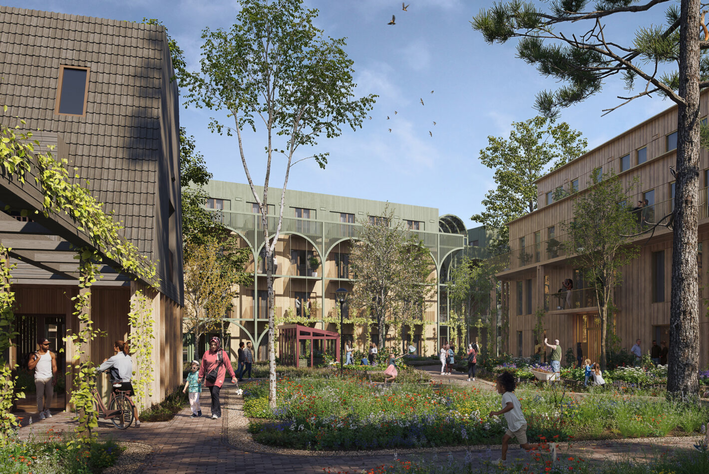 Architecturally, the design reinterprets historical estate typologies through varied rooflines, articulated volumes, and expressive silhouettes, while establishing a shared visual language through the use of circular, bio-based, and recycled façade materials. The spatial layout encourages interaction, with open sightlines, shared spaces, and subtle transitions between private and communal areas. Public and private realms are carefully integrated. Shared gardens, balconies among the tree canopy, and wide verandas blur the boundary between indoor and outdoor life. The architecture encourages physical activity and social connection, inviting residents to take the stairs, meet neighbours in communal spaces, or garden together.