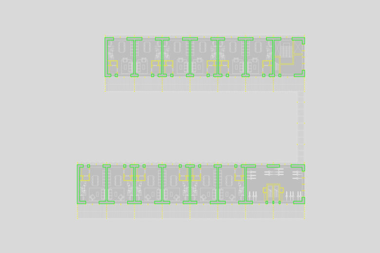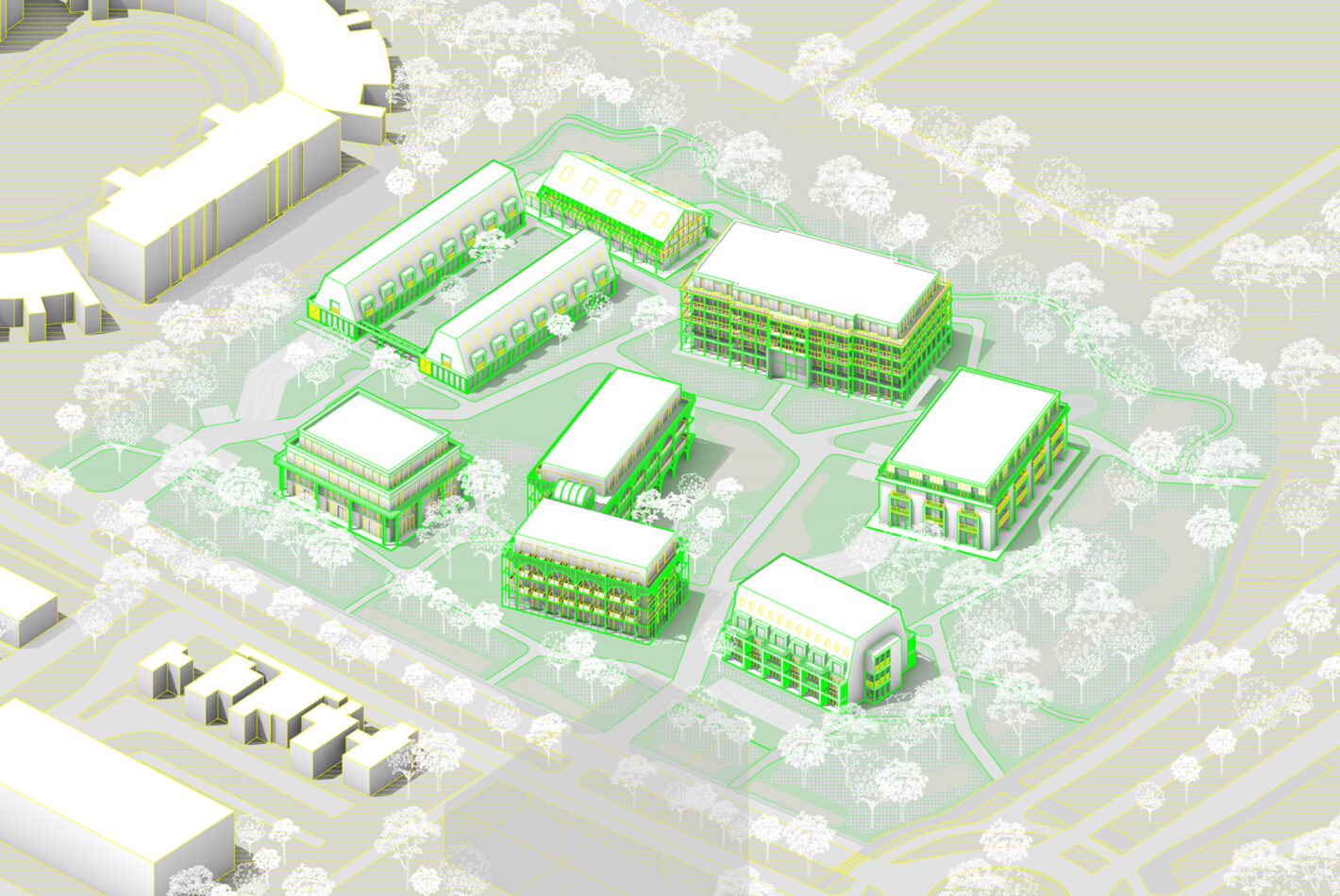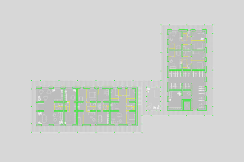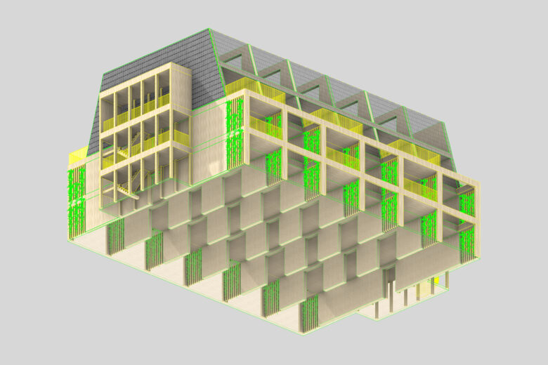 The 155 dwellings are mixed in typology and price category. Homes are owner-occupied, with the exception of the cooperative building—De Orangerie—which contains 30 rental units across social, mid-range, and market-level housing. Developed in close collaboration with the housing cooperative, De Orangerie features collective spaces on each floor surrounding a central stairwell, a rooftop greenhouse, and a ground-floor community room at the heart of the neighbourhood. A distinctive green steel framework creates sheltered outdoor rooms and gives the building its recognisable silhouette.